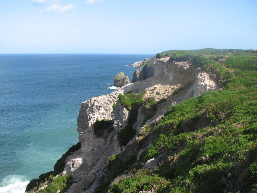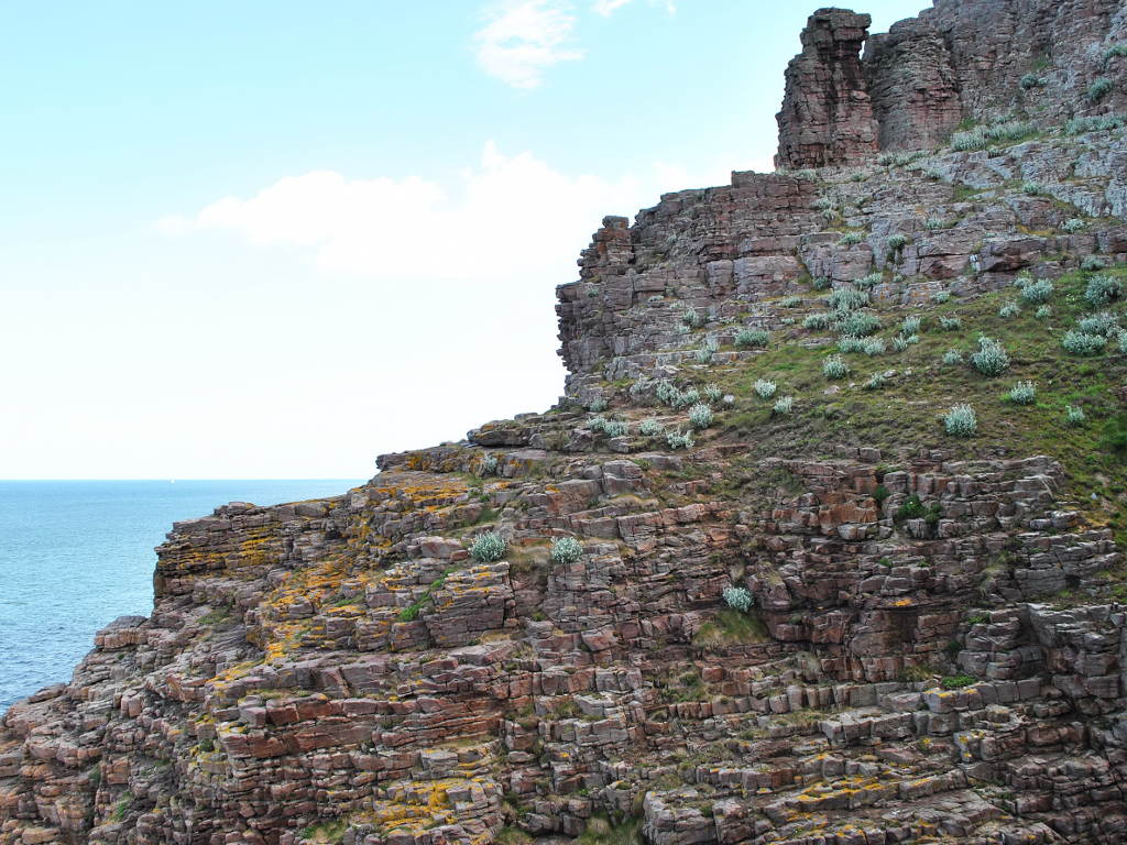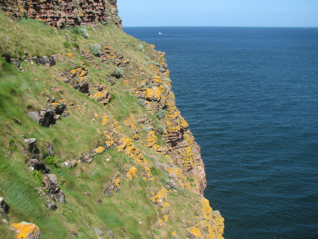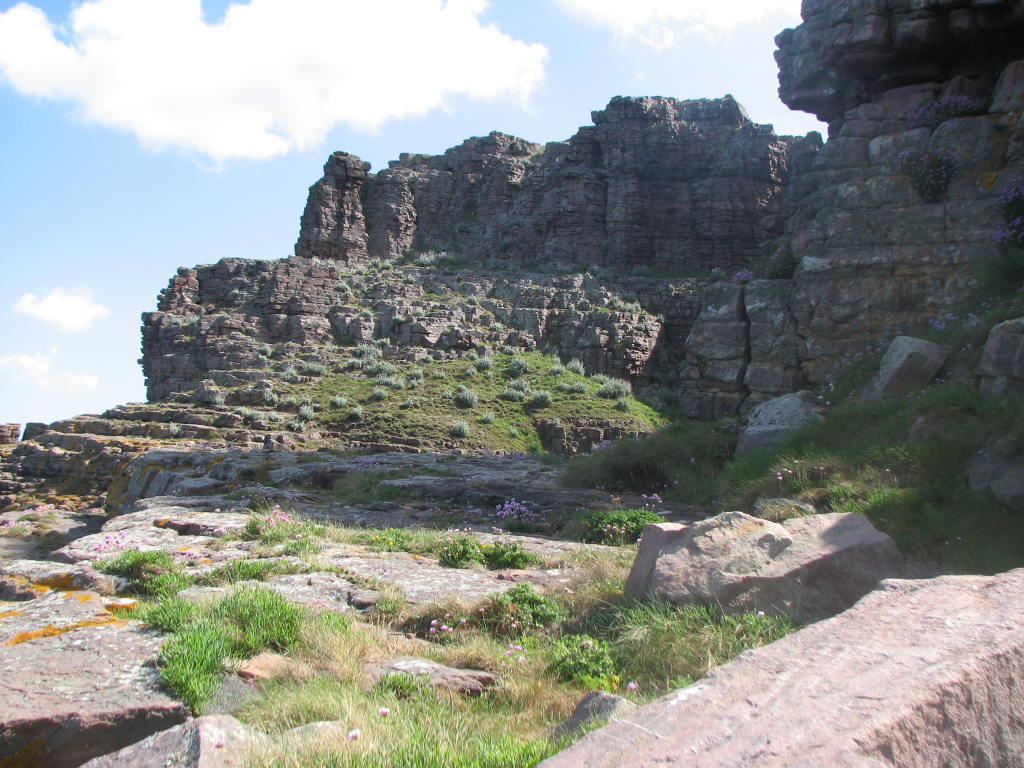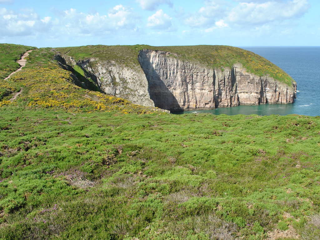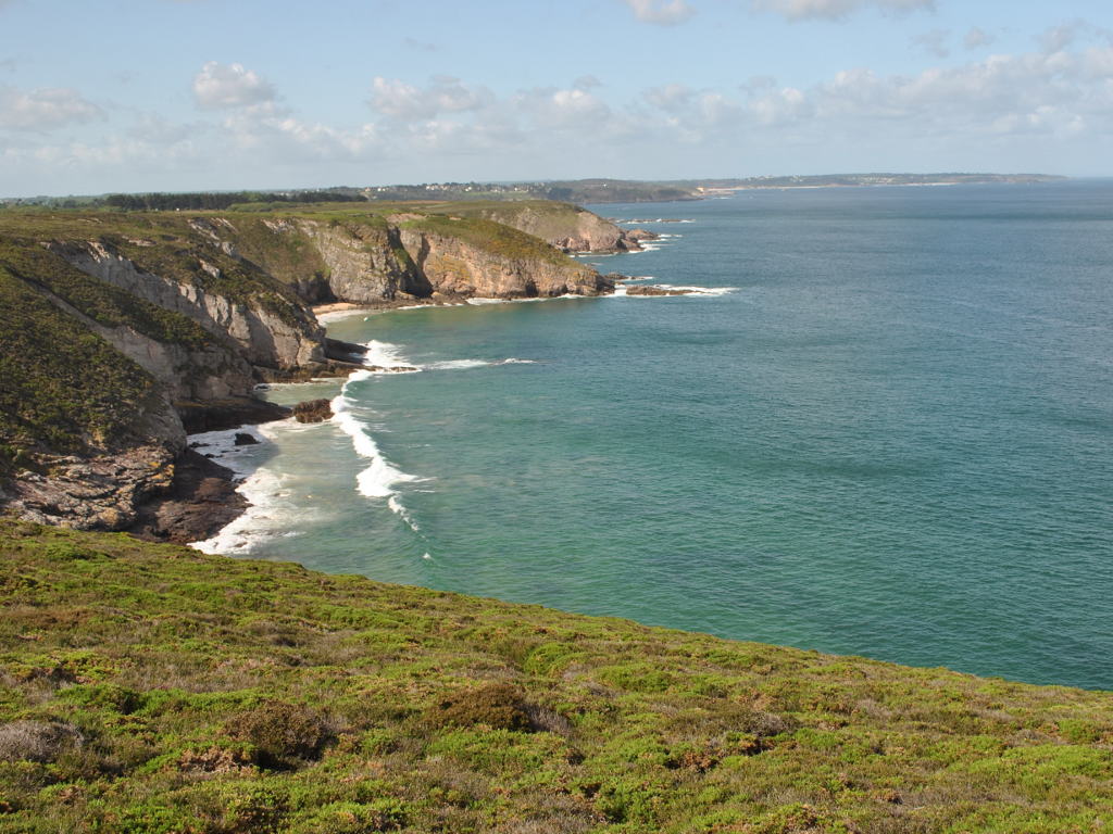 Dès le départ, nous étions noyées dans une immensité de lande multicolore, et très rapidement, nous avons découvert les spectaculaires falaises teintées de rouge du Cap Fréhel. Un drôle de langage s'est alors instauré, fait de « hoo, ouah, youhou », et les clics des appareils photo se sont fait entendre. Arrivés sur le cap, on s'est séparé provisoirement, Bernard (non voyant), guidé par J-C et Dominique la femme d'Hervé, qui a le vertige, ont shunter la partie difficile pour aller prendre un véritable bain de soleil en bord de falaise, face à l'immensité bleue, et au rocher aux oiseau, où plus d'un millier de mouettes et goéland séjournent à l'année, et nichent en ce moment : spectacle magique que de les voir se battre pour un petit bout de paille.