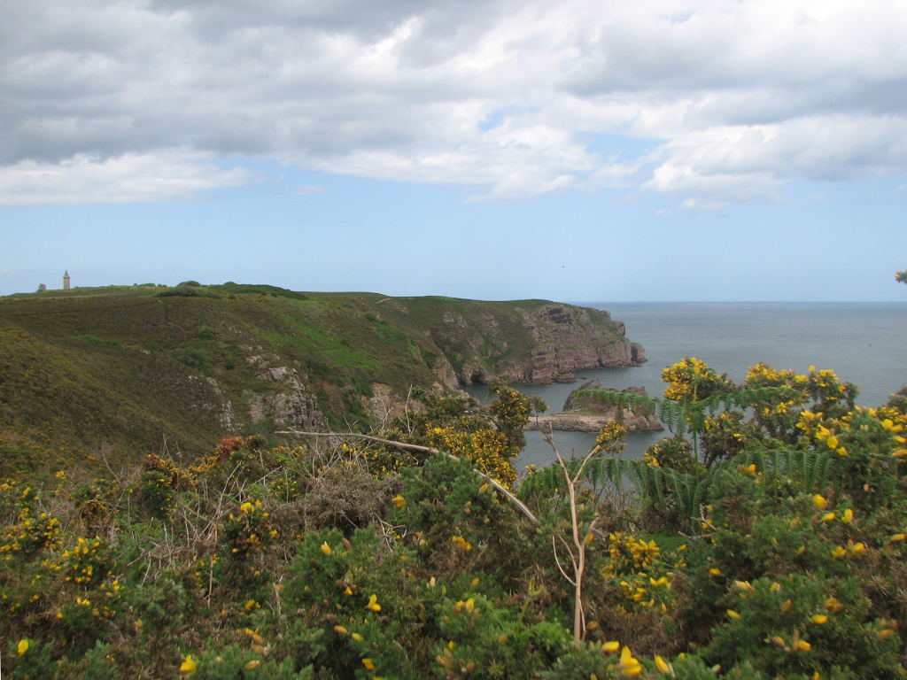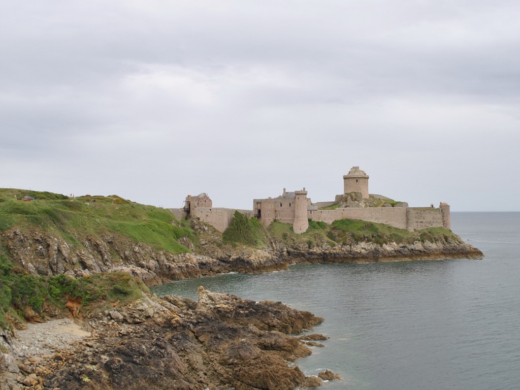 Le groupe s'est ensuite reconstitué et est repartit en direction du magnifique Fort La Latte, avec à sa droite la lande éblouissante de couleurs, et à sa gauche la falaise rouge et la mer couleur émeraude. A chaque pas, le château nous offrait des vues de plus en plus belles. Question nudité nous n'étions pas gâtés sur cette portion de circuit, car nous avons croisé peu de randonneurs, mais de façon régulière. Aussi, une petite pluie légère a fait son apparition juste pour le pique nique, suffisante pour gâcher un peu notre superbe panorama, nus sur une pointe rocheuse avec vue sur le Fort à droite et sur le Phare à gauche. Après ce repas très rapide et humide, nous avons continué, passant devant l'entrée du Fort, sur la côte de la baie de la Frênaye (ou Fresnaye) qui est moins spectaculaire mais très belle aussi. La forêt côtière fait de pins maritimes et de feuillus mélangés, nous abritait de la pluie avant que quelques éclaircies fassent leur apparition.