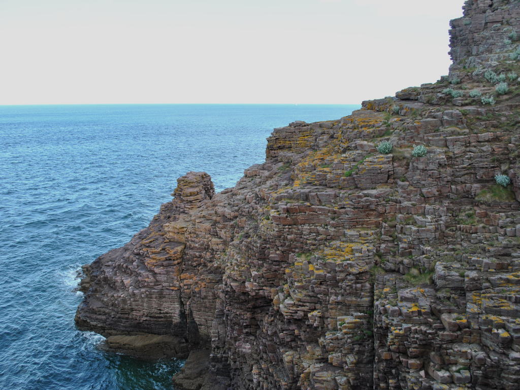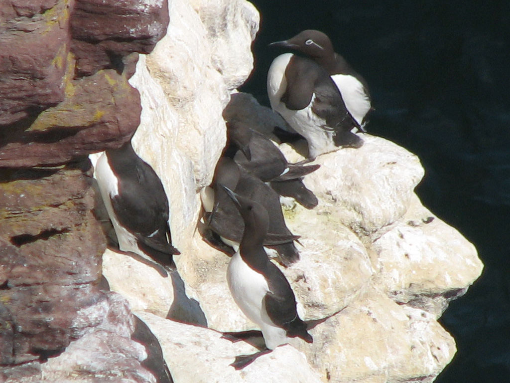 Le reste du groupe a pris un chemin vertigineux, où Gérard nous a fait un grosse frayeur en faisant une chute (glissade contrôlée) de 2m de haut, pour tomber sur moi. Heureusement sans gravité pour lui qui s’en sort avec une petite foulure, moi, j'ai été entrainé par cette chute, et j'ai désormais les fesses qui ressemblent à celle d’un singe. Remis de nos émotions, nous avons poursuivit par l’observation des oiseaux qui nichent à seulement quelques mètres de nous, des Cormorans, plusieurs sortes de Goéland, dont un couple de Goélands argentés en pleine explication musclée, des Mouettes par millier, quelques Pingouins Torda, des Pétrels fulmar, Guillemots de Troïl ,etc… Du coup, le passage étroit et un peu dangereux est passé comme une fleur, car tout le monde était émerveillé par ces observations et par la beauté saisissante du Cap Fréhel. 1h15 pour faire 300m c’est un record de lenteur !