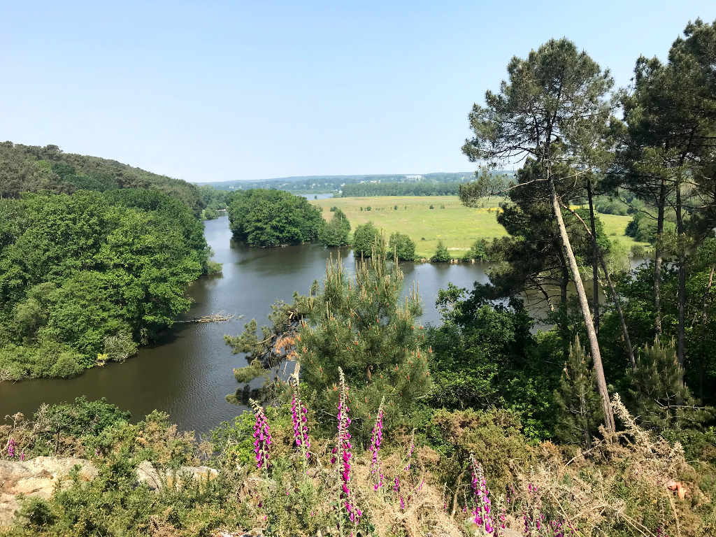 Le site de l’Ile aux Pies, vaste étendue aménagée pour les loisirs familiaux se présente à nous. L’Oust s’est frayé un passage entre deux éperons rocheux et s’écoule paisiblement.
