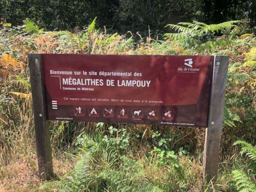 Après deux heures de marche nous arrivons à notre point de pique-nique, avec vue sur le site mégalithique de Lampouy. Sur place un randonneur a fait sourire toute la compagnie car il est vêtu d’un collant noir de contention, et par cette chaleur (30 °C) aïe aïe aïe !