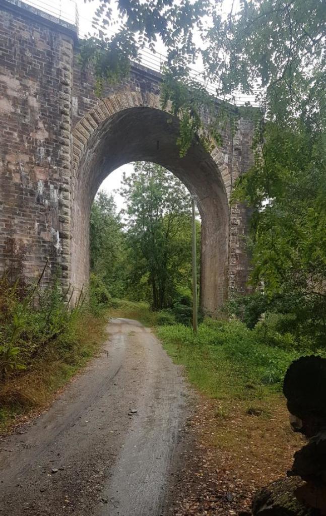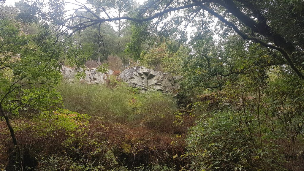 En attendant que tout le monde soit arrivé nous nous sommes retrouvés à 5 pour prendre un café. Puis nous nous sommes rendus en voiture au pied du viaduc de la Corbinière où nous avons garé nos véhicules. Aprés s'être mis en tenue avec quand même quelques capuches ,nous avons commencé notre rando en s'enfonçant dans les bois humides. Un large chemin en pente douce nous a conduit tout doucement vers la falaise dominant la Vilaine. Trés vite le crachin s'est arrêté et nous nous sommes tous retrouvés en tenue de peau. De ce sous bois émanait une trés agréable odeur de pin, fougères et bruyères mouillés, et cela nous a conforté dans l'idée que nous avions bien fait de ne pas céder au découragement face à une météo trés défavorable et rébarbative au départ. Nous avons poursuivi notre ascension et avons découvert une grotte creusée au 18ième siècle par un ermite en quête de solitude. Aprés quelques photos d'usage nous nous sommes approchés de la falaise aprés s'être rhabillés puisque 1 monsieur et ses 2 garçons étaient déja présents sur le site. Ce qui ne nous a pas empêché de profiter du haut de notre promontoire schisteux de la beauté de ce paysage avec comme toile de fond le cheminement de la Vilaine au fond de la vallée. Nous avons repris notre randonue toujours en tenue de peau puisque la pluie a laissé place à une belle luminosité et une douce chaleur ce qui n'était pas pour nous déplaire.