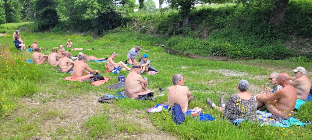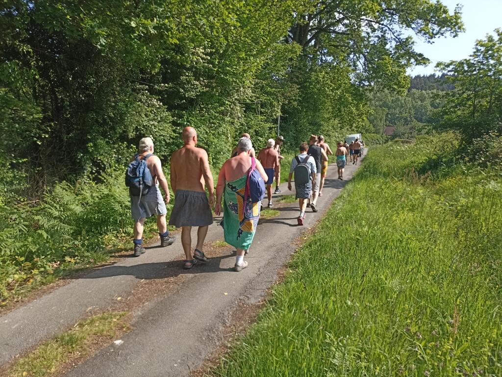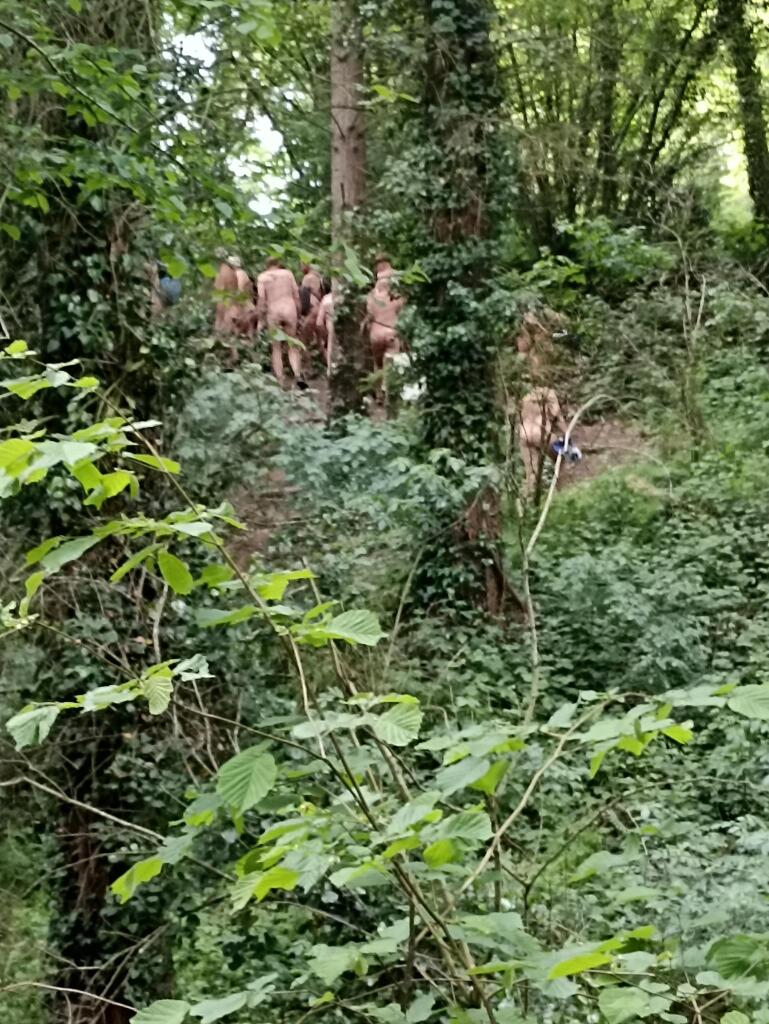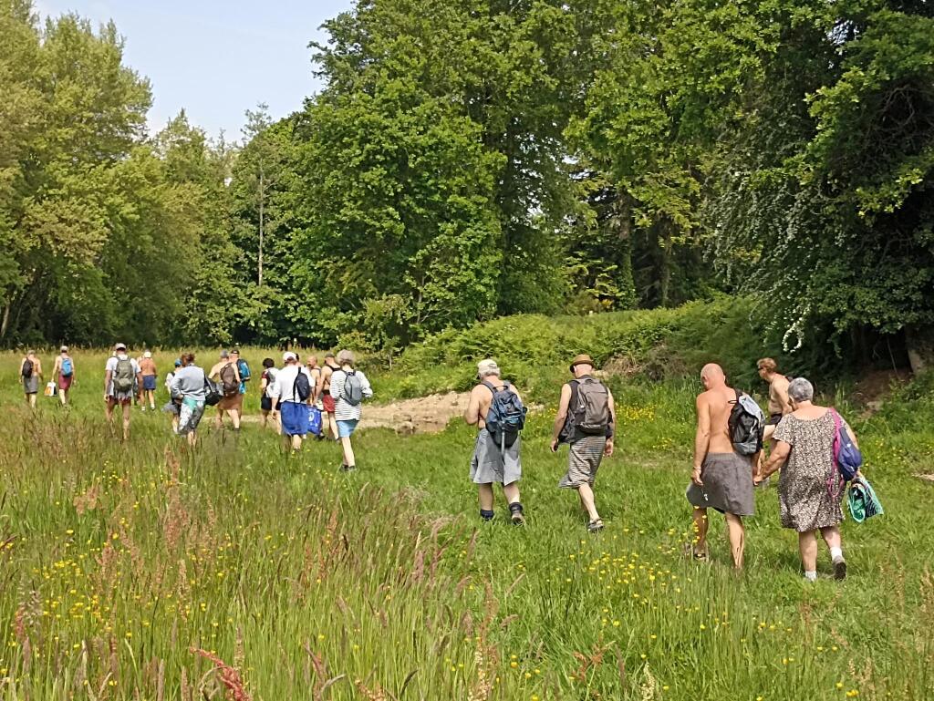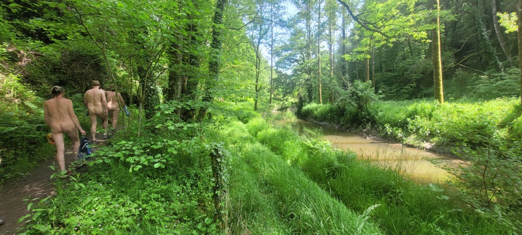En fin de matinée, nous avons suivi le sentier du circuit semi découvert en longeant en contrebas de la route principale. À l'arrière du groupe nous étions 4, nous avons eu la surprise au bout du chemin rejoignant le pont en bois l'interpellation d'une personne travaillant pour le conseil général d'I et V. Il nous a aperçus de la route où nous étions presque tous dévêtus alors il est venu nous signaler qu'il fallait au moins garder la serviette dans les endroits découverts et qu'il y avait des enfants à faire des activités pas très loin. Il nous à suivis qques instants pour voir si on respectait sa demande et est ensuite parti avec son véhicule puis nous, on à rejoint vers le lavoir le reste du groupe jusqu'au parking à 12h15 pour prendre nos sacs de pique nique de la pause déjeuner.