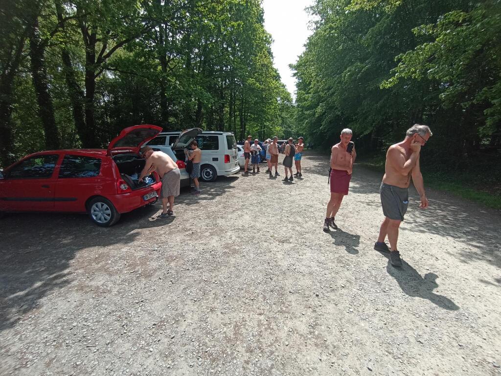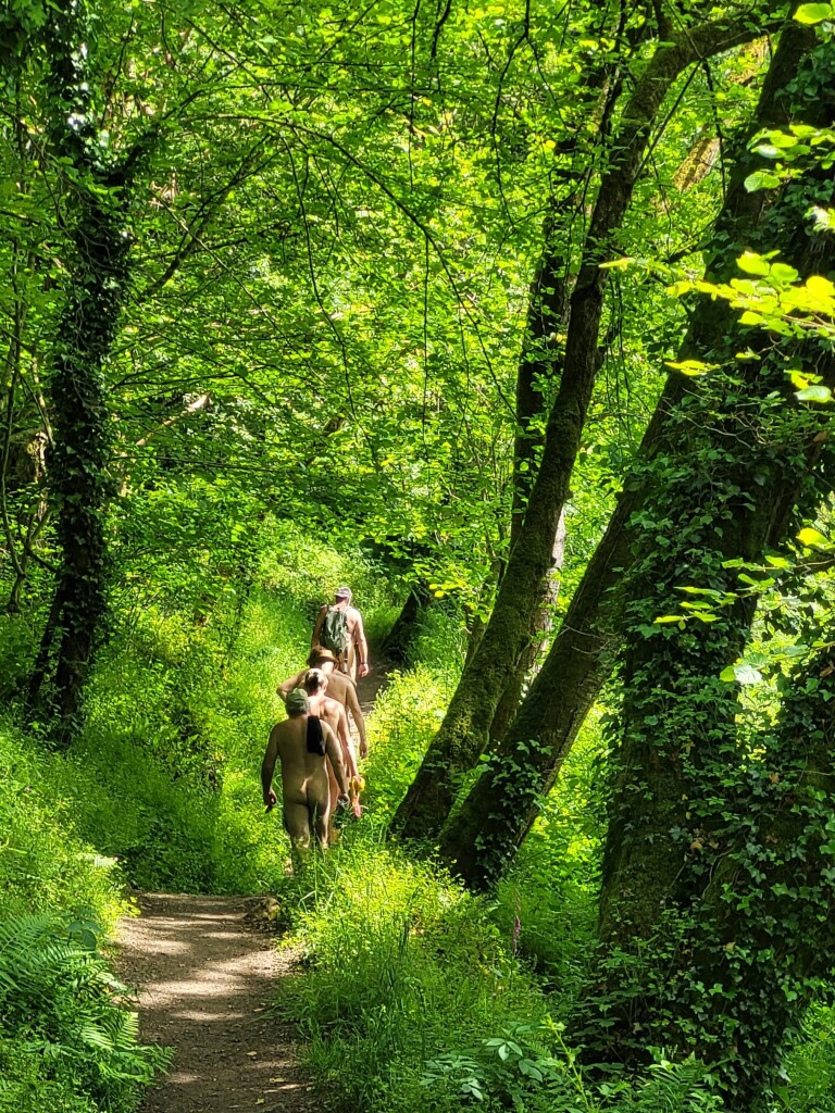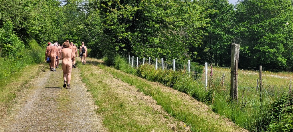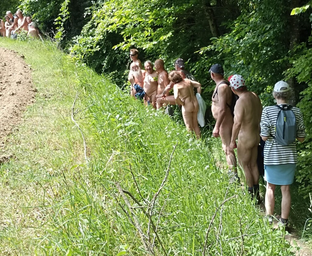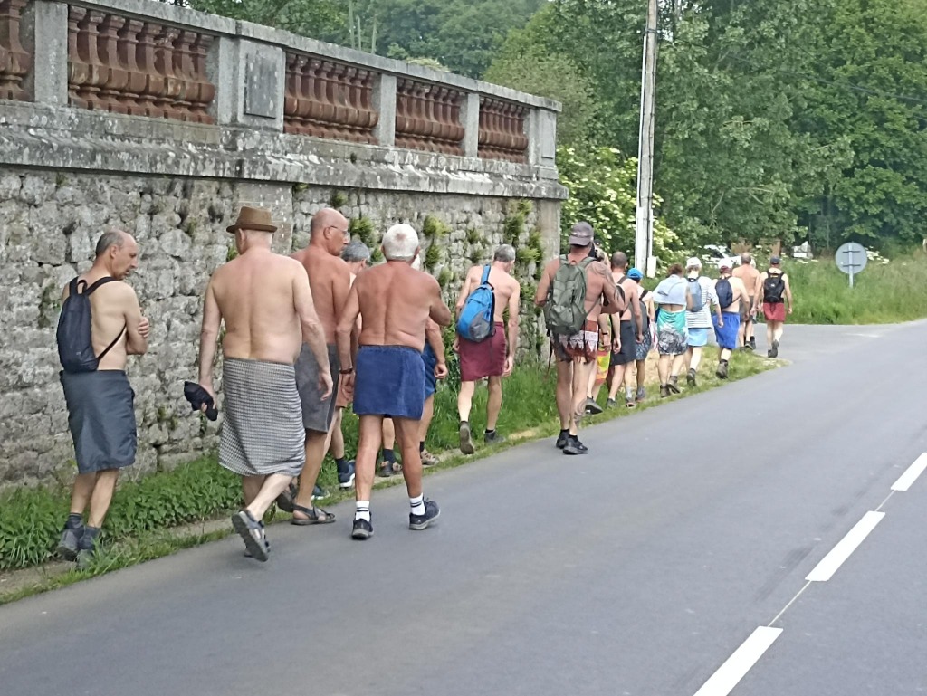 En fin de matinée, nous avons suivi le sentier du circuit semi découvert en longeant en contrebas de la route principale. À l'arrière du groupe nous étions 4, nous avons eu la surprise au bout du chemin rejoignant le pont en bois l'interpellation d'une personne travaillant pour le conseil général d'I et V. Il nous a aperçus de la route où nous étions presque tous dévêtus alors il est venu nous signaler qu'il fallait au moins garder la serviette dans les endroits découverts et qu'il y avait des enfants à faire des activités pas très loin. Il nous à suivis qques instants pour voir si on respectait sa demande et est ensuite parti avec son véhicule puis nous, on à rejoint vers le lavoir le reste du groupe jusqu'au parking à 12h15 pour prendre nos sacs de pique nique de la pause déjeuner.