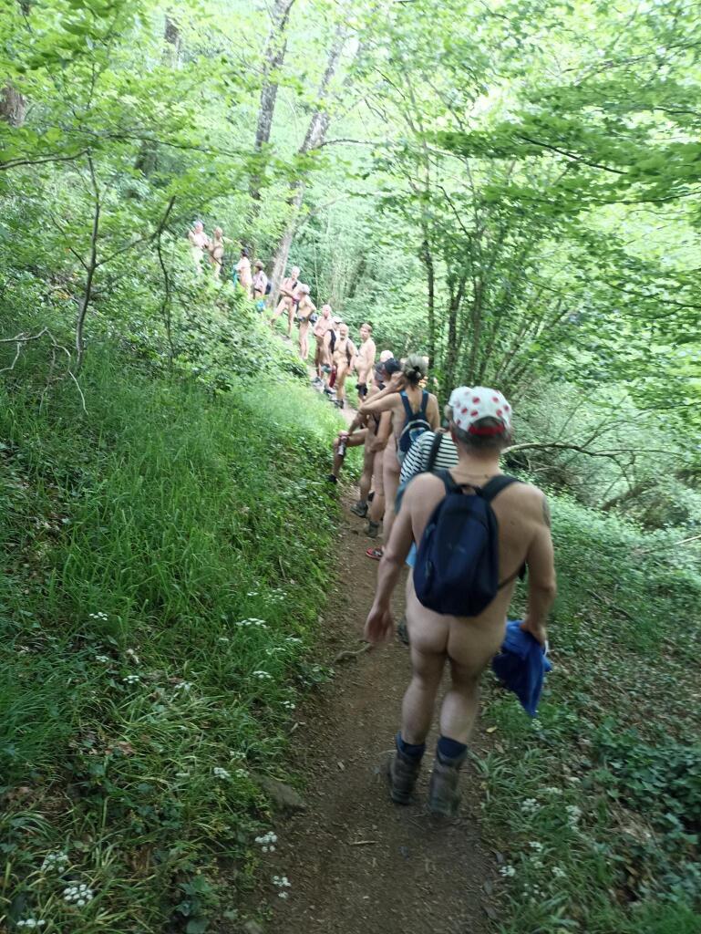 Quelques moments plus tard nous avons eu le privilège d'approcher le belvédère pour admirer la vallée au dessus de la rivière. A diverses intersections, les premiers attendaient les derniers pour regroupement avec pauses boissons si besoin. Nous avons retraversé un joli pont en bois avec une pause photo et ensuite l'autre groupe de randonneurs nous à croisé à une intersection de chemins et ils nous ont laissé passer avant de continuer aussi leur parcours (ils étaient au courant par Nathalie que nous faisions rando en naturiste).