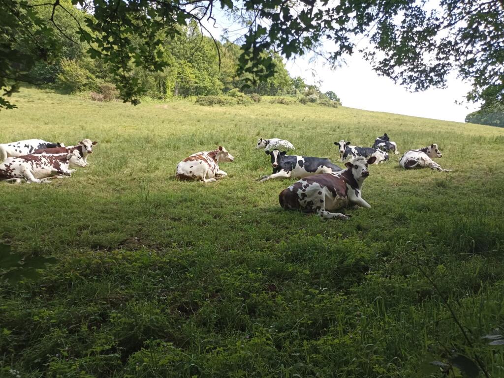 La plupart se sont dévêtus après la 1ère intersection de route puisque nous avions davantage de soleil sur chemins de campagne qui étaient plus aérés le long des champs en découvert et nous sommes également passés à coté d'un troupeau de vaches couchées tranquillement dans un pâturage en pause ruminant .. En milieu de matinée nous avons eu le plaisir de longer un peu la rivière pour ensuite la traverser par un ancien pont de bois grillagé au sol.