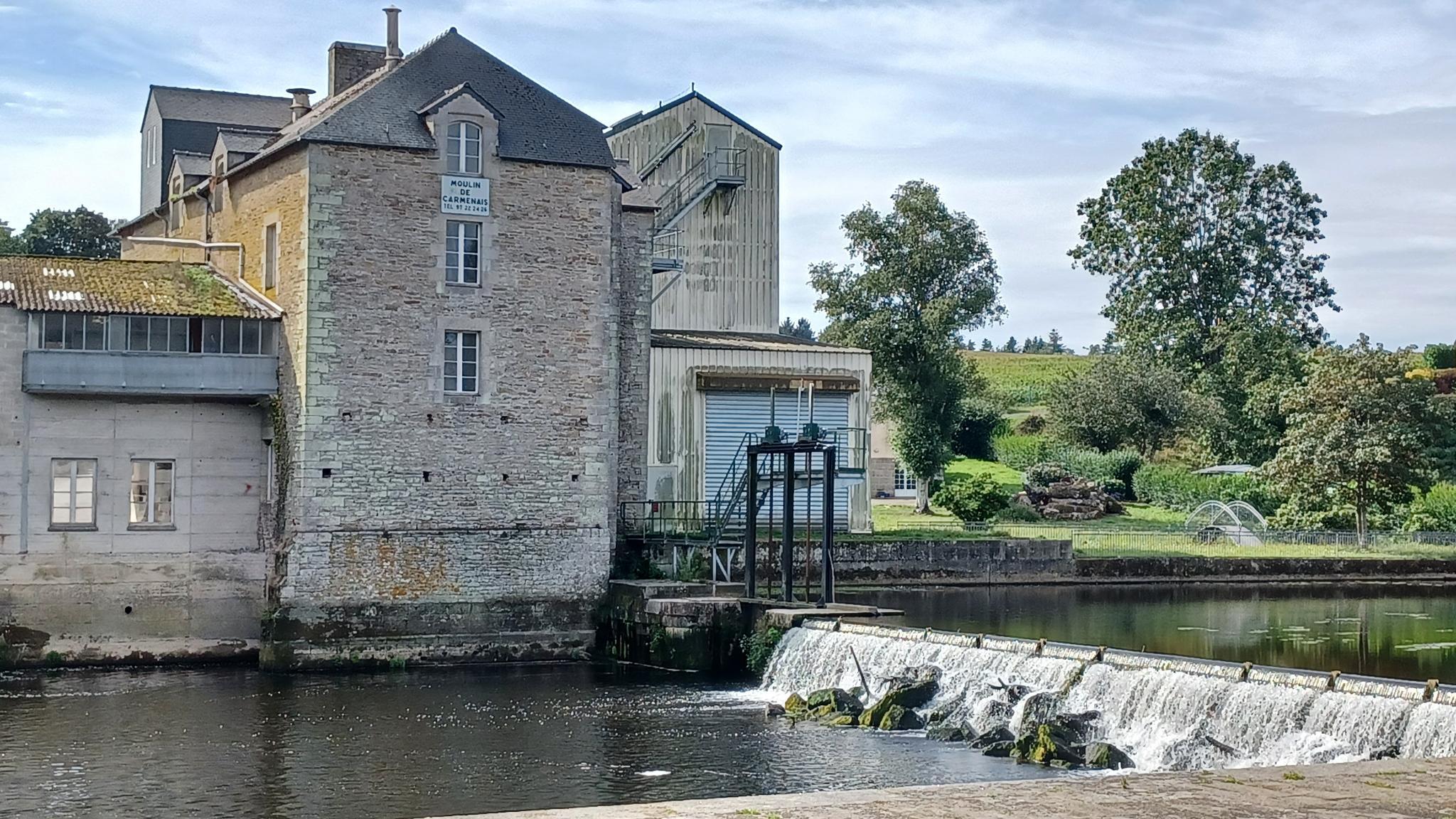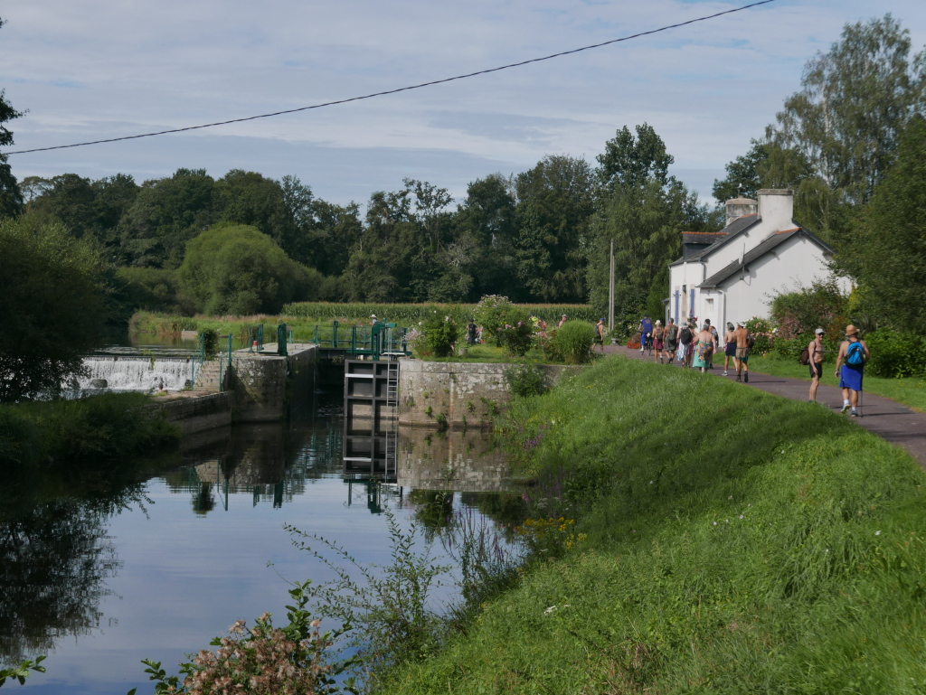 Le départ s’est fait depuis un parking herbu au bord du canal de Nantes à Brest, sur la commune de Guillac. La matinée a comporté 2 phases : une première partie sur le chemin de halage jusqu’au moulin de Carmenais, très belle mais malheureusement trop fréquentée par des cyclistes textiles, ce qui nous a amené à nous textiliser trop souvent, à la hâte, à chaque passage, aux cris de «vélo». Au moulin de Carmenais, petite halte textile et photos du groupe devant l’écluse.