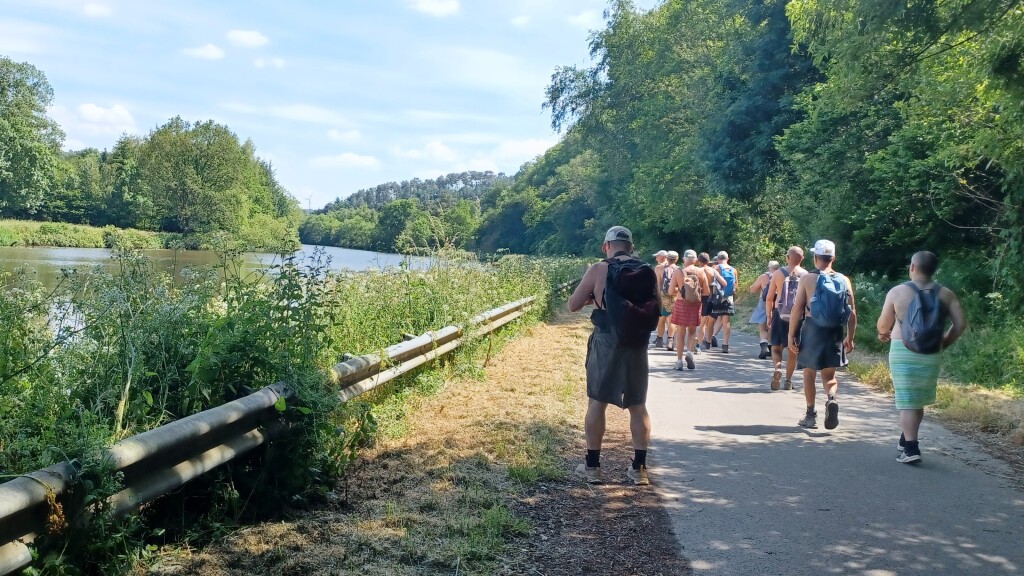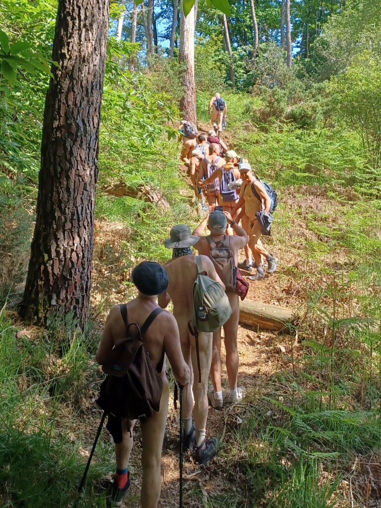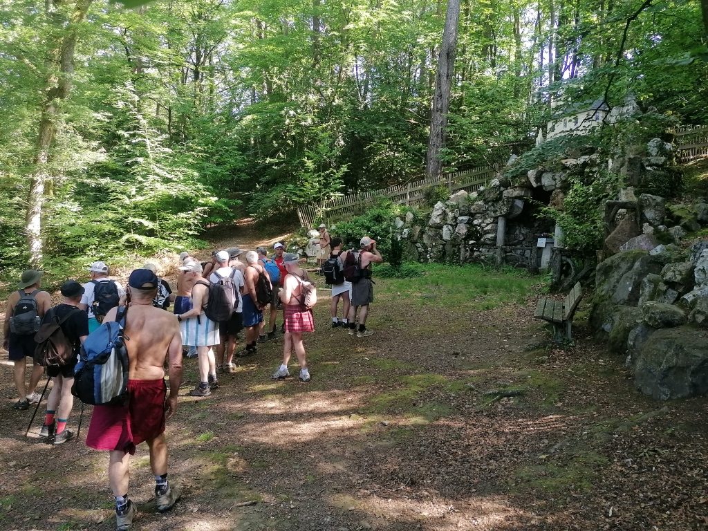 Les participants du jour arrivent petit à petit au lieu de rendez vous. Je me présente aux autres et j'essaie de retenir les prénoms mais nous sommes 22 randonneurs aujourd'hui. Une fois tout le monde arrivé, on doit reprendre les voitures car où l'on se trouve est l'arrivée et non le départ. Sur le lieu de départ, on met le minimum de vêtements sur nous puis nous nous mettons en route. Une fois dans les bois, un premier arrêt pour admirer la Vierge; nous nous déshabillons. Le parcours est assez vallonné mais avec la bonne ambiance, cela est facile.