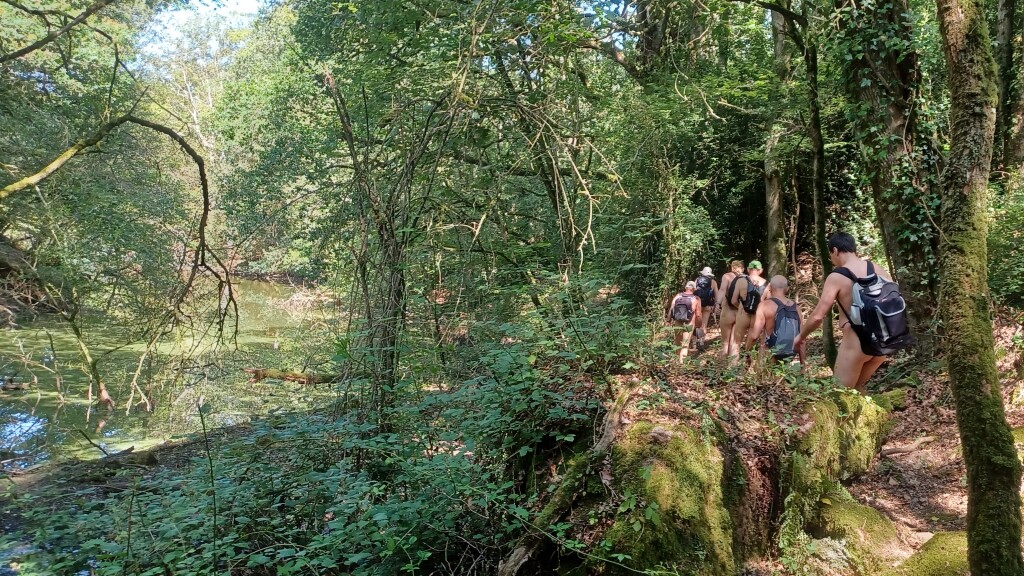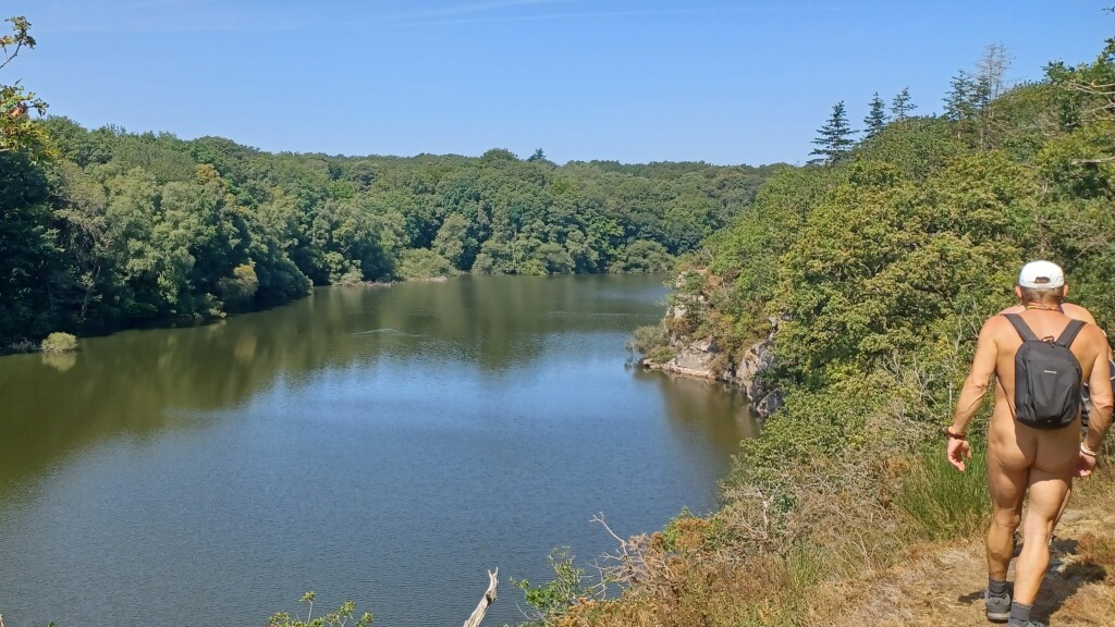 On a croisé une femme avec son chien et un enfant en début de rando, on les a croisés à couvert, puis quelques kilomètres plus loin dans les sentiers en serpentin, on a été pris de court par une joggeuse, qui avait l'air ouverte d'esprit en disant "bonjour, il fait bon, vous devez être bien nus!". On a juste eu le temps de se couvrir pour la deuxième qui avait sans doute plus de mal à suivre.