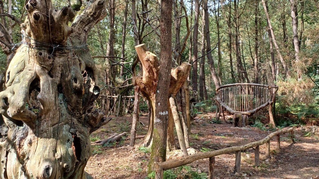 Tout d'abord le château de "Beaumont" et sa forêt "privée", puis un espace où des petits menhirs se dressaient parmi les herbes. Ensuite un détour avec une montée qui en a fait souffrir certains : un village entièrement dessiné en bois et pierres de la forêt par un sculpteur.