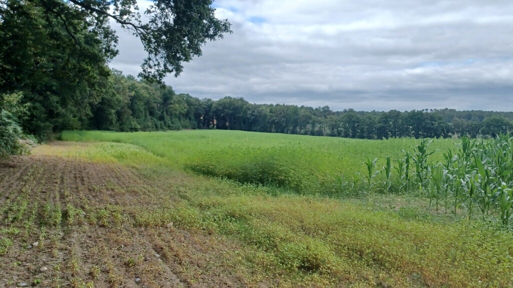 13h : un champs de foin fraichement fauché sera notre pause déjeuner convivial. Champs de maîs, fougères, ronces, ajoncs, hautes herbes auront été notre quotidien tout au long du parcours.