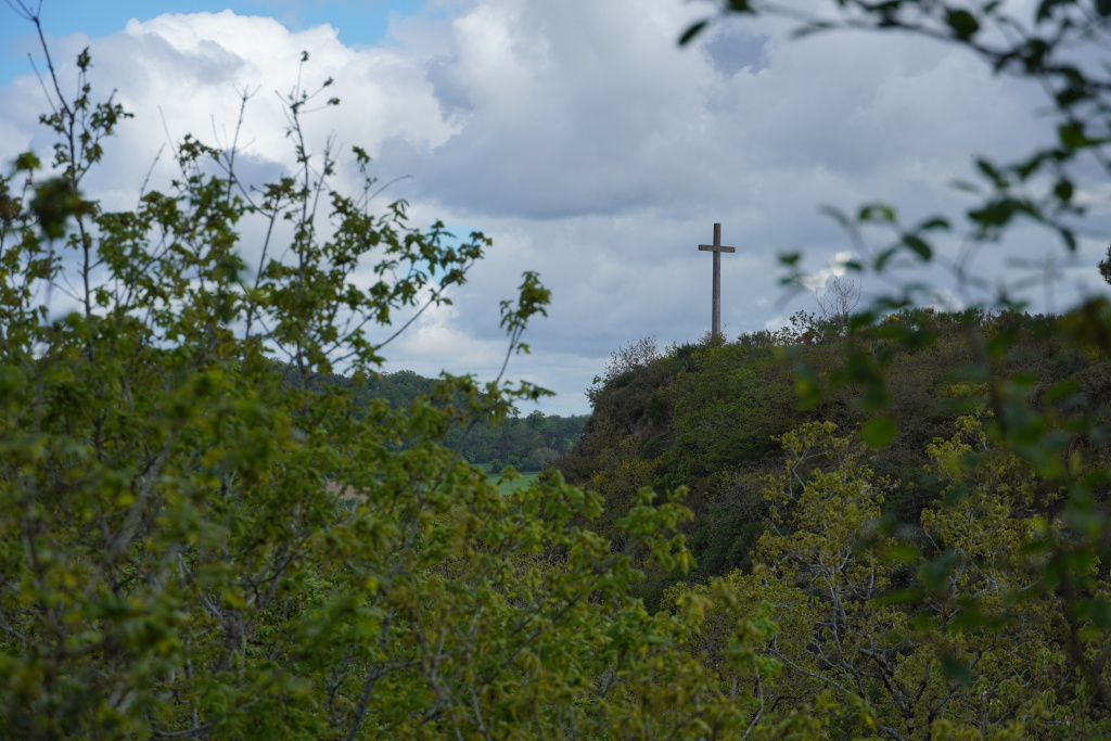 Puis on remonte un petit peu et on arrive à une grande statue de Notre Dame, la première des "bondieuseries" comme les appelle Dominique. Effectivement, tout au long du haut de la colline on retrouve statues, chapelles, voire une grotte de Lourdes. Il n'y a personne, sauf un monsieur avec son chien. On a vu le chien bien avant son maître, on a eu largement le temps de se couvrir, mais le monsieur avait l'air pas très heureux en voyant notre tenue. Il ne répondait pas à nos bonjours. Il y en a aussi des comme ça...