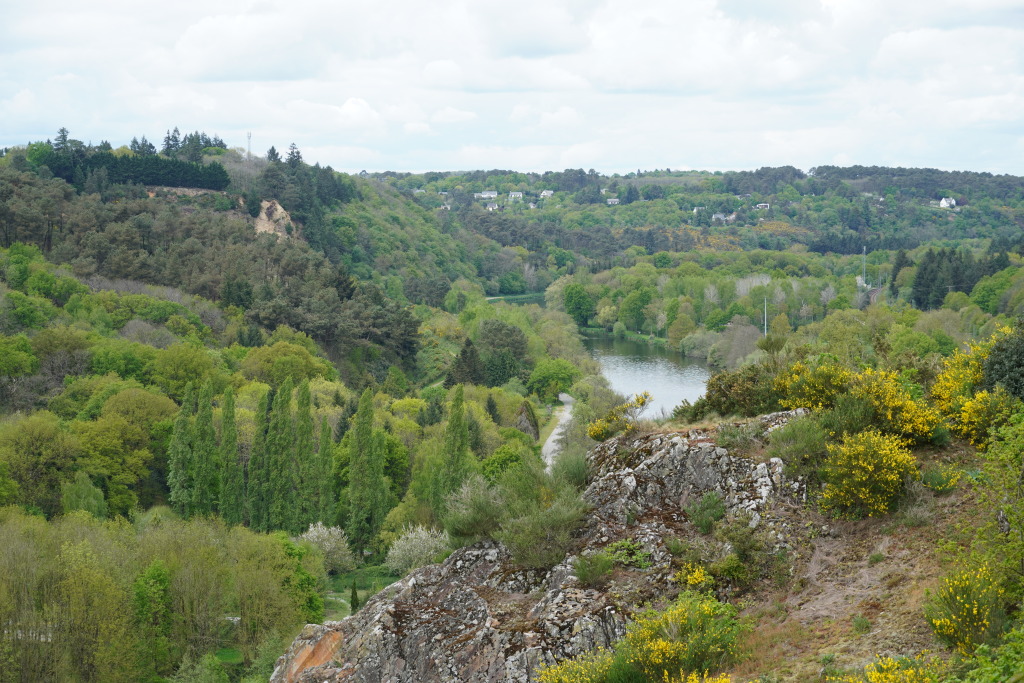 Toujours le long de la rivière on passe sous le pont du chemin de fer pour suivre un large chemin d'exploitation entre les prés, la seule partie plate de la rando, mais toujours avec de jolies vues en face. Suit après la seule partie sur route, 500 mètres environ, et c'est de nouveau un dédale de sentiers dans la forêt avec des montagnes russes prévues pour faire le fou en VTT. Ceci nous mène vers le Rocher d'Uzel, dernier point de vue panoramique sur la Vilaine et les alentours, et peut-être le plus spectaculaire.