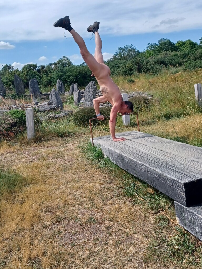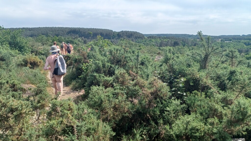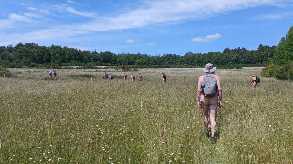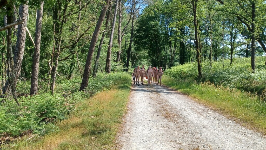 Départ de St Just, pour finir sur les landes de Cojoux où se dressent les megalithes. Ça a été une belle aventure (on a parfois dû se frayer un chemin dans cette nature luxuriante). Marcher en groupe sur une randonnée naturiste, c'est une expérience unique, surtout avec un cadre aussi magnifique que les landes de Cojoux et les mégalithes.