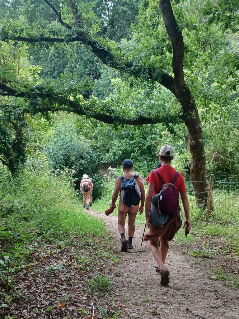 Nous voilà prêts pour une randonnée de 16km sur le circuit du barrage du Bois Joli ; circuit qui suit le Frémur, petit fleuve qui délimite deux départements l'Ille-et-Vilaine et les Cotes d'Armor. Une fois sortis du bourg après plusieurs hésitations sur la direction à prendre nous marchons sur un chemin : déjà les personnes habituées se retrouvent dans leur tenue préférée, moi j’attends un peu et puis me voilà comme tout le monde au bout de 500m en tenue d'Adam.
