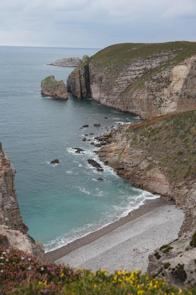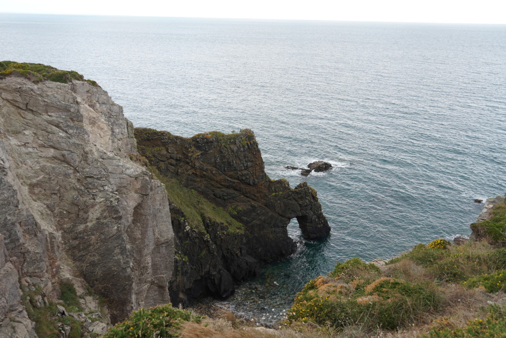 Et c'est parti, la première partie se fait en bord de route, puis sur le GR sans végétation haute. La vue est magnifique avec un peu de vent et pas de soleil. On aperçoit le phare du Cap Fréhel qu'on rejoint sans avoir pu se mettre en tenue de peau. Les touristes sont encore là et relativement nombreux. Alors que la pluie s'est invitée, nous profitons des arches pour nous abriter ...