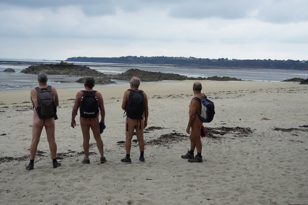 La nature est plus importante et plus sauvage. On est tous en tenue de peau et là c'est un plaisir sans mesure. C'est aussi plus escarpé mais c'est juste génial. L'ambiance est très bonne et tout le monde s'attend dans les passages plus difficiles. Quelques alertes sur le parcours mais je mets juste mon paréo à la taille. Je suis devenu un randonneur naturiste pour mon plus grand plaisir. Une partie vraiment agréable avec tous, une photo groupée, tous nus sur la plage avant de remonter vers les voitures toujours en tenue de peau.... Et pour finir, on se retrouve à Fréhel pour un pot d'amitié. La belle journée se termine et chacun prend le chemin du retour.