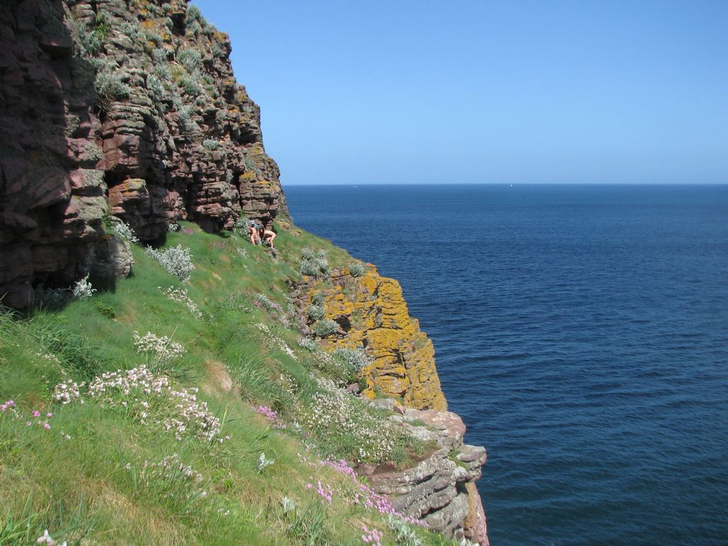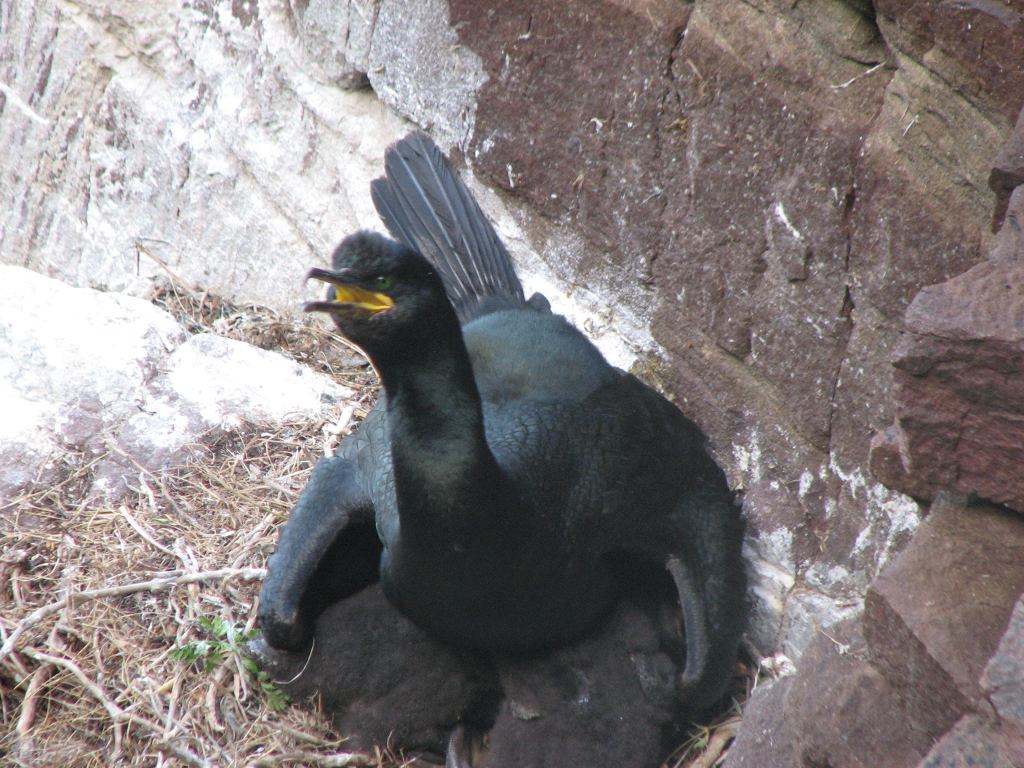 Le reste du groupe a pris un chemin vertigineux qui descend à mi-hauteur de la falaise abrupte. De part et d'autre de l'étroit sentier alternent les nichées de Cormorans, de plusieurs sortes de Goéland (dont un couple de Goélands argentés en pleine explication musclée), de Mouettes par millier, de Pingouins Torda, de Pétrels fulmar, de Guillemots de Troïl ...